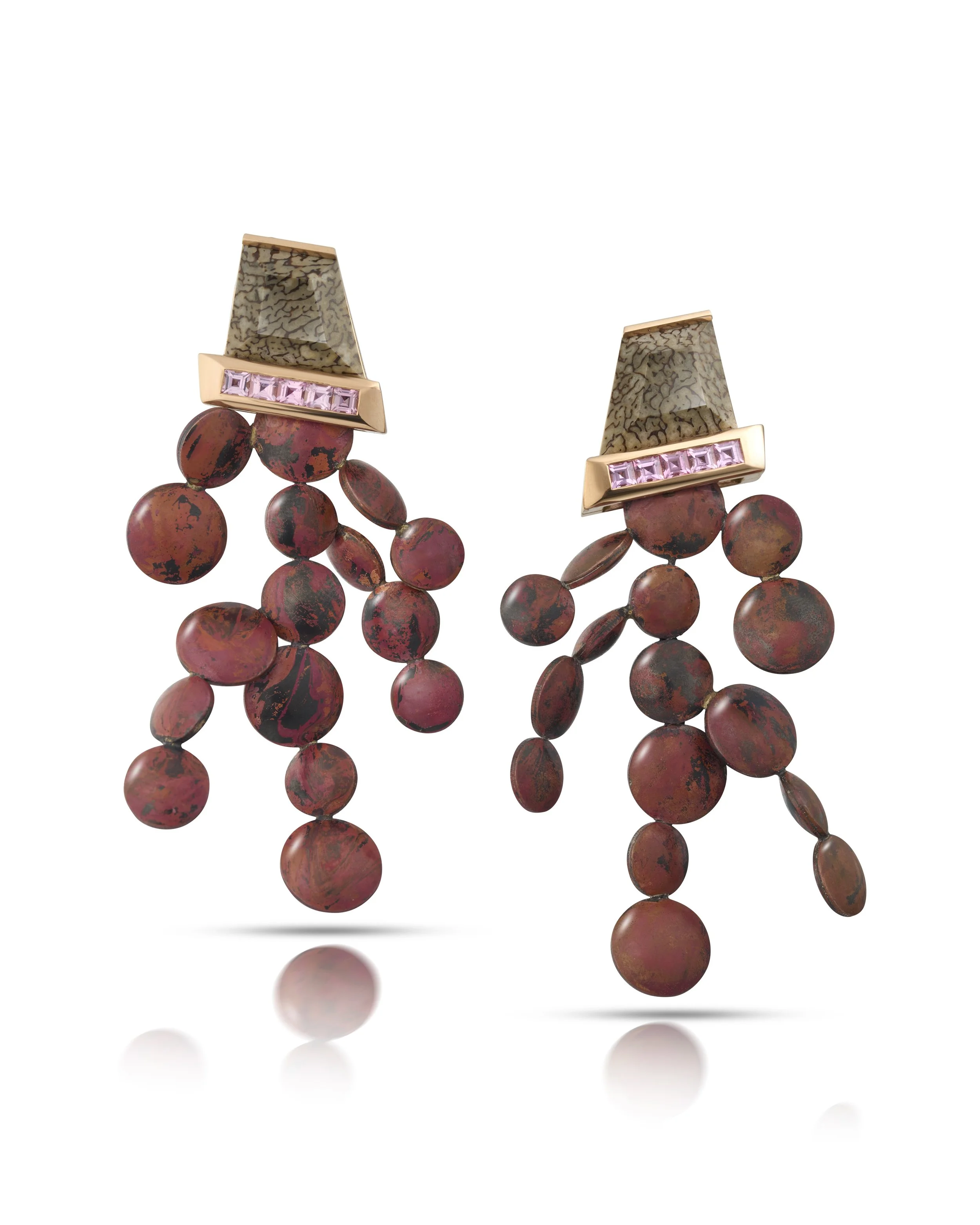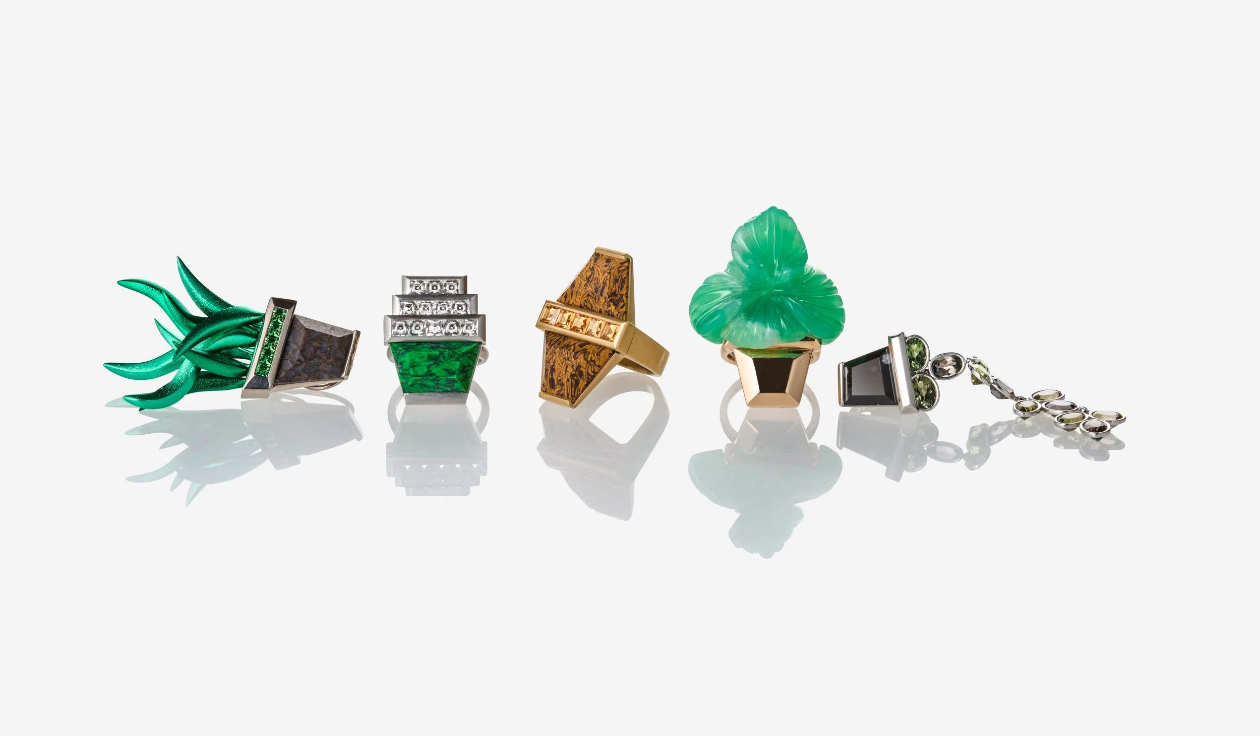 The ´Pottering Around´collection consists of a wide range of unconventional and previously unused materials used to make up the pieces. 3D printed in titanium coloured titanium, gold and carved hardstones.
